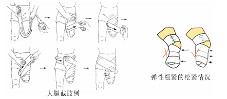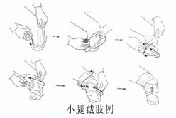 ?。?)其纏繞步驟,先順沿殘肢長軸方向包繞2——3次,然后再盡可能地纏向外上繞成螺旋狀。對于大腿截肢的殘肢,為避免中途脫落。應纏繞至骨盆部;小腿截肢的中、短長度殘肢,需纏繞至膝關節(jié)。